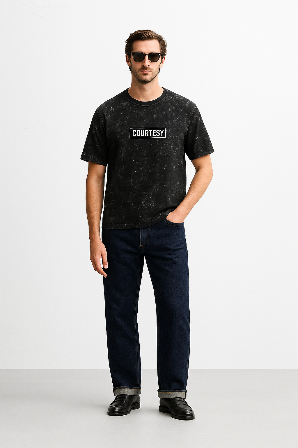 Make a bold statement with our "COURTESY" Vintage Wash Oversized Tee. Crafted from premium cotton, this black marble t-shirt features a unique distressed acid-wash pattern that gives off an effortlessly edgy vibe. The standout white "COURTESY" print on the back adds a touch of minimalism with a message that resonates. Designed for comfort and streetwear appeal, the loose fit and dropped shoulders make it perfect for casual wear or layering.