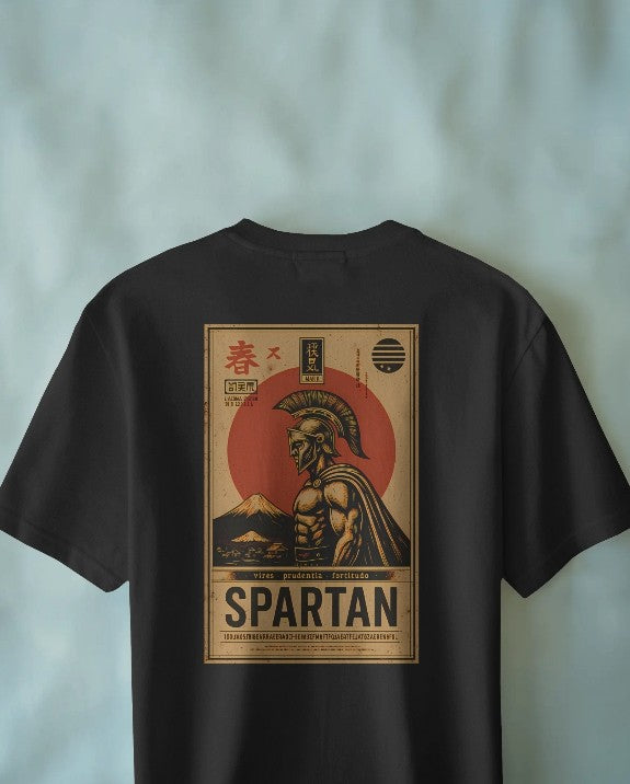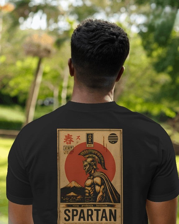 Awaken the warrior within. This bold design combines Spartan heritage with a Japanese-inspired rising sun backdrop and Latin virtues: Vires (Strength), Prudentia (Wisdom), Fortitudo (Courage). Ideal for gym wear, casual outings, or a statement piece.