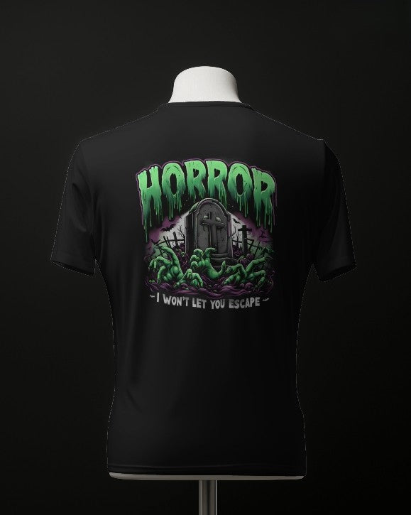 Step into the shadows with the Horror Grave Escape Tee, a spine-chilling design for true horror fans. Featuring rotting zombie hands clawing their way out of the grave beneath a decaying tombstone, this graphic pops with neon greens and purples against a dark backdrop. The dripping “HORROR” text and bold line “I WON’T LET YOU ESCAPE” send a clear message — there’s no running from the fear! Perfect for Halloween, horror events, or just everyday badassery.