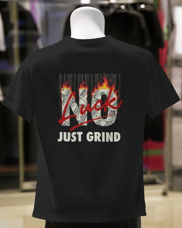Unleash your inner hustler with the bold No Luck, Just Grind tee — a powerful statement for go-getters who believe in hard work over handouts. Featuring flaming dollar-bill lettering and a striking red slash through the word "Luck," this design screams determination, grit, and relentless ambition. Perfect for entrepreneurs, dream-chasers, and anyone who’s building their empire one grind at a time.