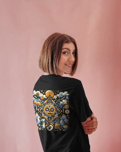 Step into a world where ancient mysticism meets modern chaos with the Cosmic Ritual Oversized T-Shirt — a bold fusion of streetwear and spiritual symbolism. Designed for individuals who crave art, freedom, and deeper meaning in what they wear, this tee features a powerful skull mandala centerpiece surrounded by a constellation of surreal and cosmic visuals — sunbursts, floating eyes, rockets, mountain peaks, and arcane geometry.